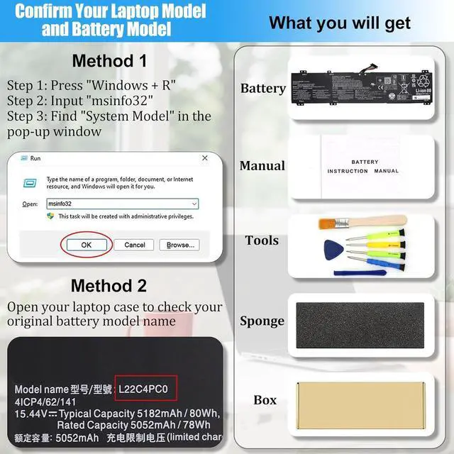 BATTERY SPECIFICATION: Model Name: L22C4PC0; Voltage: 15.44V; Capacity: 80Wh 5182mAh; Battery Type: Li-ion; Condition: 100% brand new from manufacturer; Package include: 1*battery + battery installation screwdrivers + 1*instruction for laptop battery