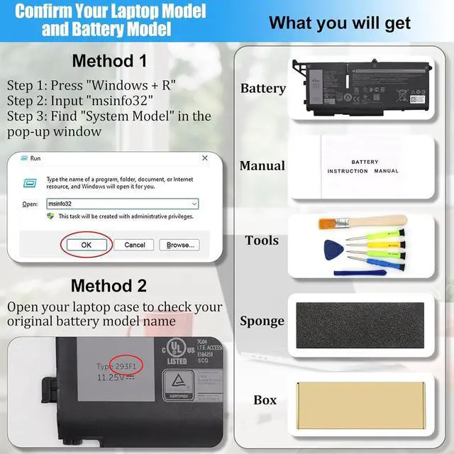 Note: There are two different types of batteries available for the listed Dell laptop models: FK0VR (58 Wh, 4-cell) and 293F1 (41 Wh, 3-cell), which differ in size. To ensure you purchase a compatible battery, we strongly recommend opening the back cover of your laptop to confirm that the battery model you need is 293F1 (41 Wh, 3-cell)