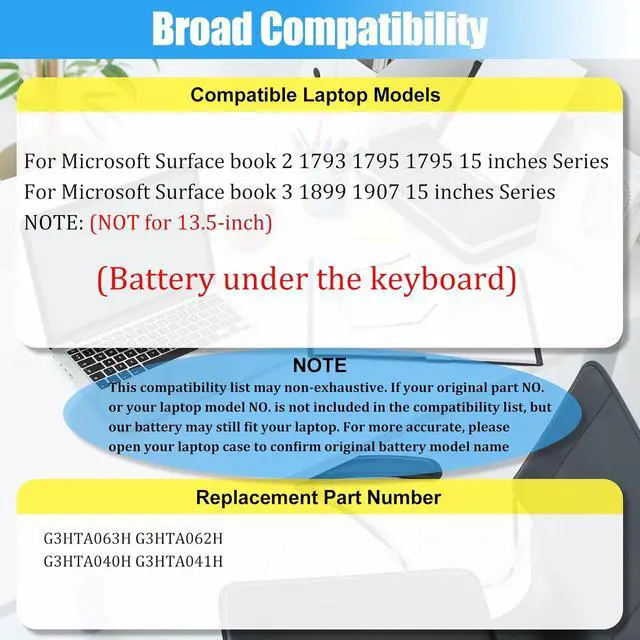 COMPATIBLE LAPTOP MODELS: This Laptop battery G3HTA063H replacement for Microsoft Surface book 2 1793 1795 1795 15 inches; for Microsoft Surface book 3 1899 1907 15 inches Series(NOT for 13.5-inch)
