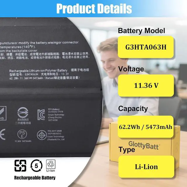 BATTERY SPECIFICATION: Model Name: G3HTA063H; Voltage: 11.36V; Capacity: 62.2Wh 5473mAh; Battery Type: Li-ion; Condition: 100% brand new from manufacturer; Package include: 1*battery + battery installation screwdrivers + 1*instruction for laptop battery