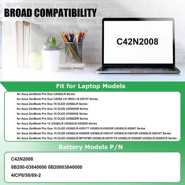 COMPATIBLE LAPTOP MODELS: Replacement for Asus ZenBook Pro 15 UX582HM UX582HS UX582LR UX582LR-H2002R Series, Asus ZenBook Pro Duo 15 OLED UX582LR Series, Asus ZenBook Pro Duo 15 OLED UX582LR-BP1979R UX582LR-H0701TS UX582LR-H2002R UX582LR-H2002TS UX582LR-H2003R UX582LR-H2013T UX582LR-H2014R UX582LR-H2014T UX582LR-H2017T UX582LR-H2025R UX582LR-XS94T Series, Asus ZenBook Pro Duo UX582 LR-1BH2 LR-XS74T Series, Asus ZenBook Pro Duo UX582LR Series