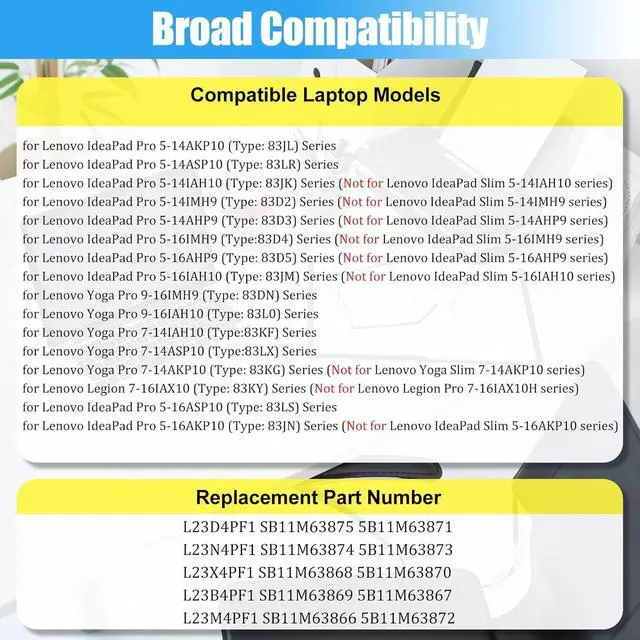 COMPATIBLE LAPTOP MODELS: Replacement for Lenovo IdeaPad Pro 5-16IAH10 (Type: 83JM) Series; for Lenovo Yoga Pro 9-16IMH9 (Type: 83DN) Series; for Lenovo Yoga Pro 9-16IAH10 (Type: 83L0) Series; for Lenovo Yoga Pro 7-14IAH10 (Type:83KF) Series; for Lenovo Yoga Pro 7-14ASP10 (Type:83LX) Series; for Lenovo Yoga Pro 7-14AKP10 (Type: 83KG) Series; for Lenovo Legion 7-16IAX10 (Type: 83KY) Series; for Lenovo IdeaPad Pro 5-16ASP10 (Type: 83LS) Series; for Lenovo IdeaPad Pro 5-16AKP10 (Type: 83JN) Series