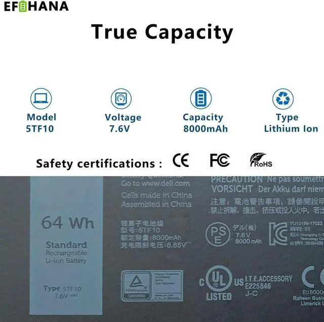 SpecificationsModel:5TF10// Battery type: Li-ion // Voltage:7.6V // Capacity:56Wh/7470mAh// 100% New from Manufacturer. Top circuit boards and smart chip.