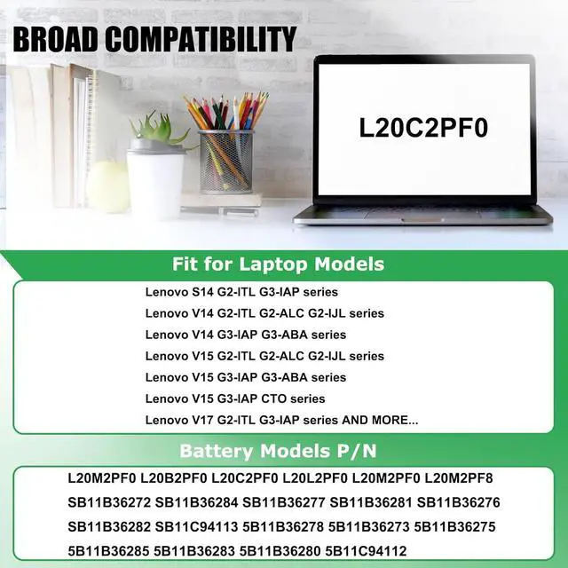 COMPATIBLE LAPTOP MODELS: Replacement for Lenovo S14 G2-ITL G3-IAP Series; for Lenovo V14 G2-ITL G2-ALC G2-IJL G3-IAP G3-ABA G4-IRU Series; for Lenovo V15 G2-ITL G2-ALC G2-IJL G3-IAP G3-ABA G3-IAP CTO G4-IRU Series; for Lenovo V17 G2-ITL G3-IAP G4-IRU Series; for Lenovo IdeaPad 3-14ADA6 3-14ALC6 3-14ITL6 3-14ABA7 3-14IAU7 Series; for Lenovo IdeaPad 3-15ADA6 3-15ALC6 3-15ITL6 3-15ABA7 3-15IAU7 Series; for Lenovo IdeaPad 3-17ADA6 3-17ALC6 3-17ITL6 3-17ABA7 3-17IAU7 3-17IRU7 Series; for Lenovo K14 Series