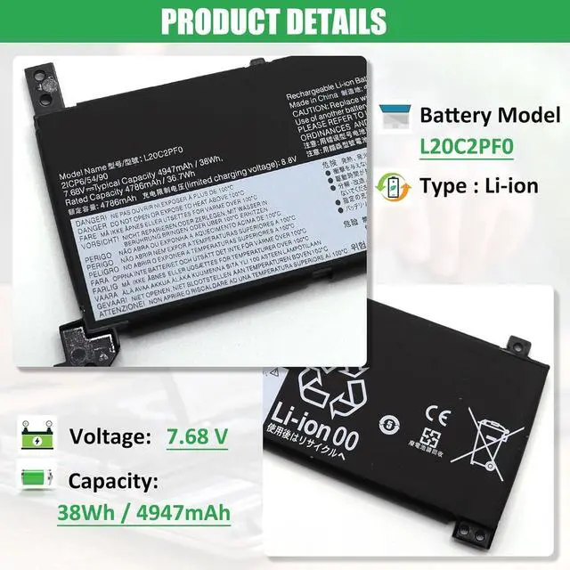 BATTERY SPECIFICATION: Model Name: L20C2PF0; Voltage: 7.68V; Capacity: 38Wh / 4947mAh; Battery Type: Li-ion; Condition: 100% brand new from manufacturer; Color: Black; Packaged come with: 1*battery + battery installation screwdrivers + 1*instruction for laptop battery