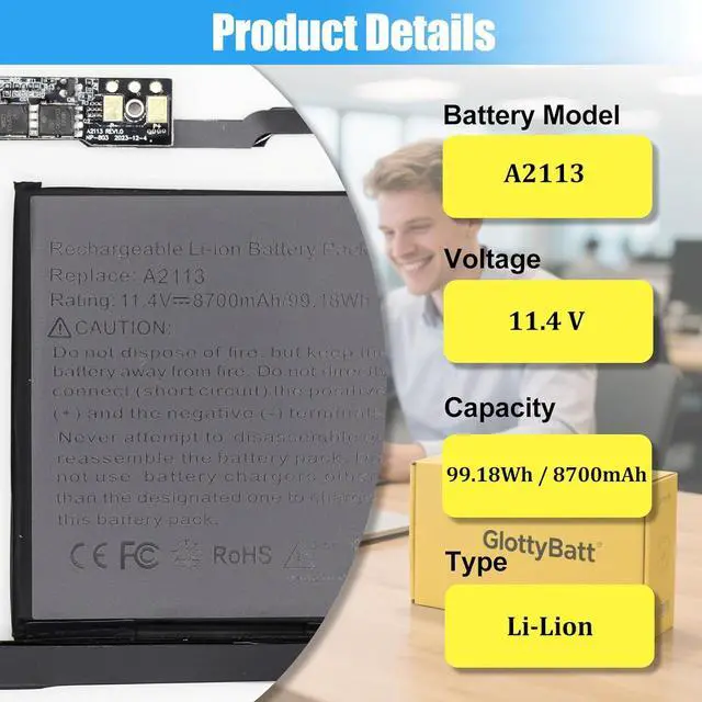 BATTERY SPECIFICATION: Model Name: A2113; Voltage: 11.4V; Capacity: 99.18Wh 8700mAh; Battery Type: Li-ion; Condition: 100% brand new from manufacturer; Package include: 1*battery + battery installation screwdrivers + 1*instruction for laptop battery