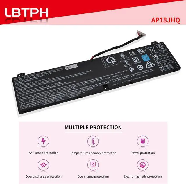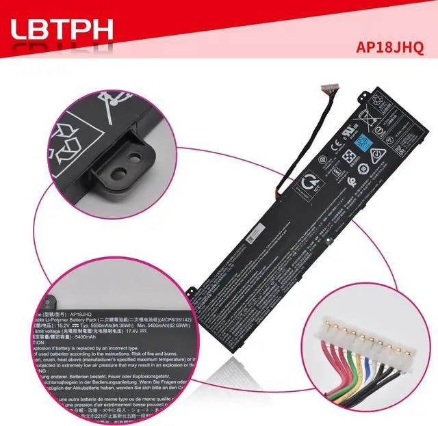 Specifications:Battery Type:Li-ion Voltage:15.2V Capacity:84.36Wh 5550mAh 4-Cell Color:Black Certificate:CE,RoHS,FCC Condition:100 Percent New from Manufacturer, Grade A Cell, 12 Months AssuranceReplace Part Number:AP18JHQ, KT.00408.001, 4ICP835142Compatible LaptopNotebook Models:Fit for ACER ConceptD 7 CN715-71 Series Fit for ACER Predator Triton 500 PT515-51 PT515-52 Series