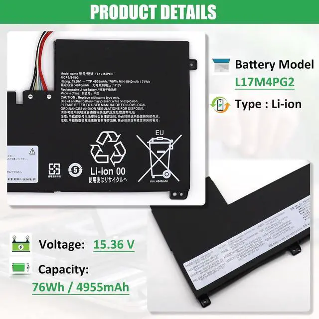BATTERY SPECIFICATION: Model Name: L17M4PG2; Voltage: 15.36V; Capacity: 76Wh / 4955mAh; Battery Type: Li-ion; Condition: 100% brand new from manufacturer; Color: Black; Packaged come with: 1*battery + battery installation screwdrivers + 1*instruction for laptop battery