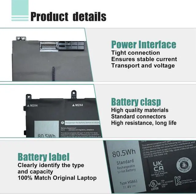 SpecificationsModel: VG661 Rechargeable Battery, Voltage: 11.4V, Capacity: 80.5Wh/6709mAh,Type: Li-ion Battery. Package include: 1* VG661 battery 1 set matching installation tools.1*Instructions for VG661 Battery. All our products up to 500 recharge cycles over the life of the battery.