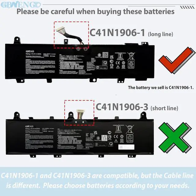 • Specifications Model: C41N1906-1 Capatity: 90Wh Voltage:15.4V Color: Black Battery type: Rechargeable Li-ion Battery Condition: 100% brand New from Manufacturer.