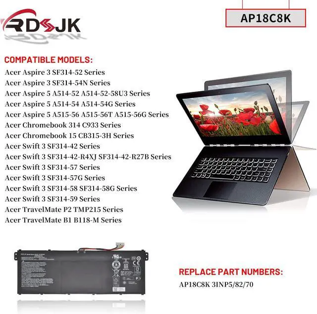 Compatible Model: Acer Aspire 3 SF314-52 SF314-54N Series, Acer Aspire 5 A514-52 A514-52-58U3 A514-54 A514-54G A515-56 A515-56T A515-56G Series, Acer Chromebook 314 C933 Series, Acer Chromebook 15 CB315-3H Series, Acer Swift 3 SF314-42 SF314-42-R4XJ SF314-42-R27B SF314-57 SF314-57G SF314-58 SF314-58G SF314-59 Series, Acer TravelMate P2 TMP215 B1 B118-M Series, Acer Swift 3 SF314-59-53S2 SF314-59-56F2 SF314-59-51GR SF314-59-59P0, Acer Aspire 5 A514-54-37X8 A514-54-51LC A514-54G-513S A514-54G-303X