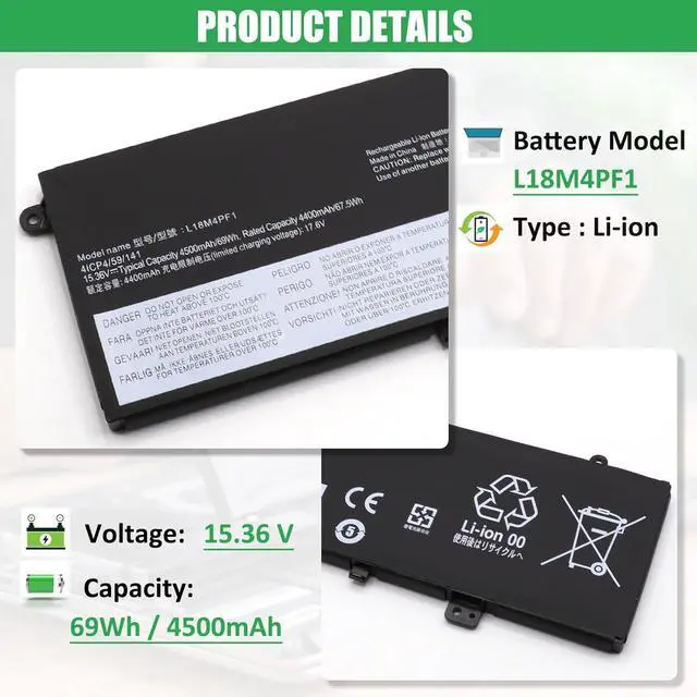 BATTERY SPECIFICATION: Model Name: L18M4PF1; Voltage: 15.36V; Capacity: 69Wh / 4500mAh; Battery Type: Li-ion; Condition: 100% brand new from manufacturer; Color: Black; Packaged come with: 1*battery + battery installation screwdrivers + 1*instruction for laptop battery