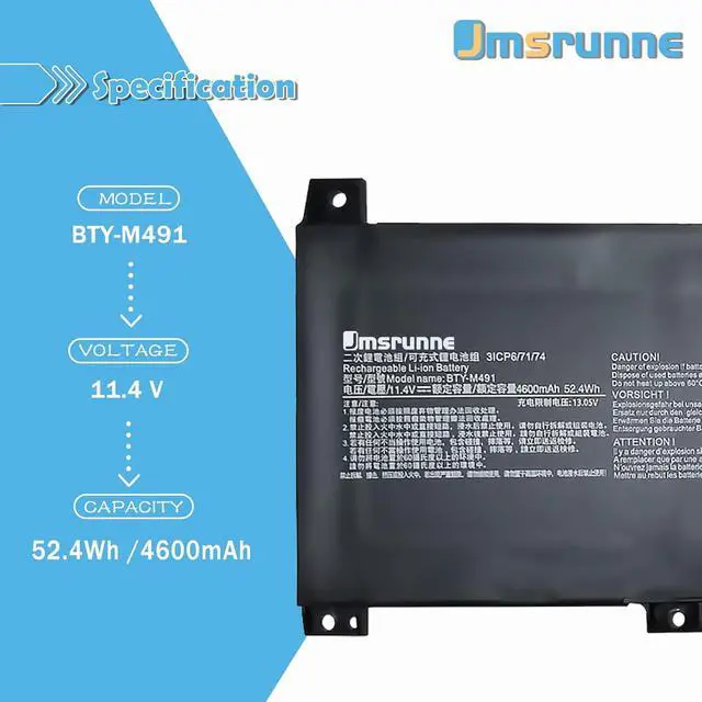 • MSI BTY-M57 Specifications Model: BTY-M57 / Voltage: 11.4V / Capacity: 52.4Wh /Battery type: Li-ion. /Battery life: Up to 1000 recharge cycles over the life of the battery. Also comes with installation tools.Please note that there are two types of BTY-M491 batteries. They have different connections. We highly suggest you open the back cover of your laptop and compare it with your old battery before making a payment.