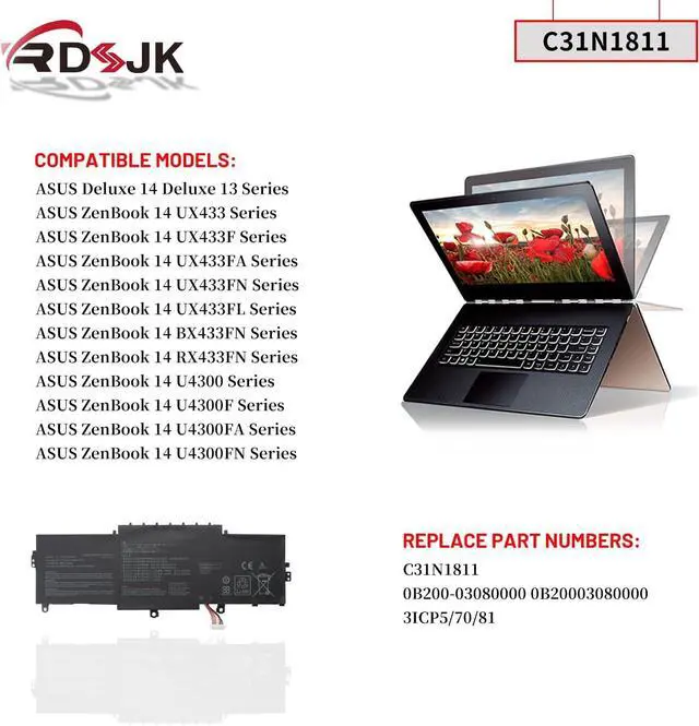 Compatible Models: Fit for ASUS Deluxe 14 Deluxe 13 Series, Fit for ASUS ZenBook 14 UX433 Series, Fit for ASUS ZenBook 14 UX433F Series, Fit for ASUS ZenBook 14 UX433FA Series, Fit for ASUS ZenBook 14 UX433FN Series, Fit for ASUS ZenBook 14 UX433FL Series, Fit for ASUS ZenBook 14 BX433FN Series, Fit for ASUS ZenBook 14 RX433FN Series, Fit for ASUS ZenBook 14 U4300 U4300F U4300FA U4300FN Series