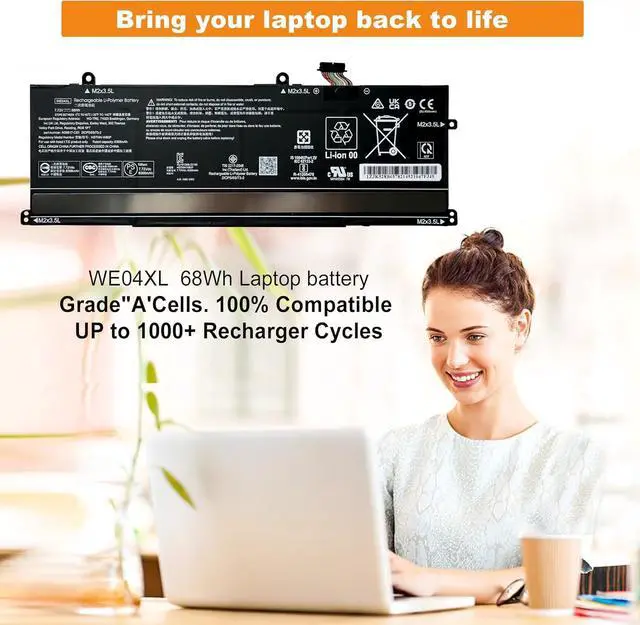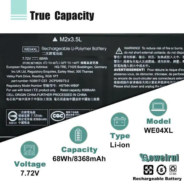 SpecificationsModel: WE04XL Rechargeable Battery, Voltage: 7.72V, Capacity: 68Wh/8368mAh ,Type: Li-ion Battery. Package include: 1* WE04XL battery 1 set matching installation tools. 1*Instructions for WE04XL Battery. All our products up to 500 recharge cycles over the life of the battery.