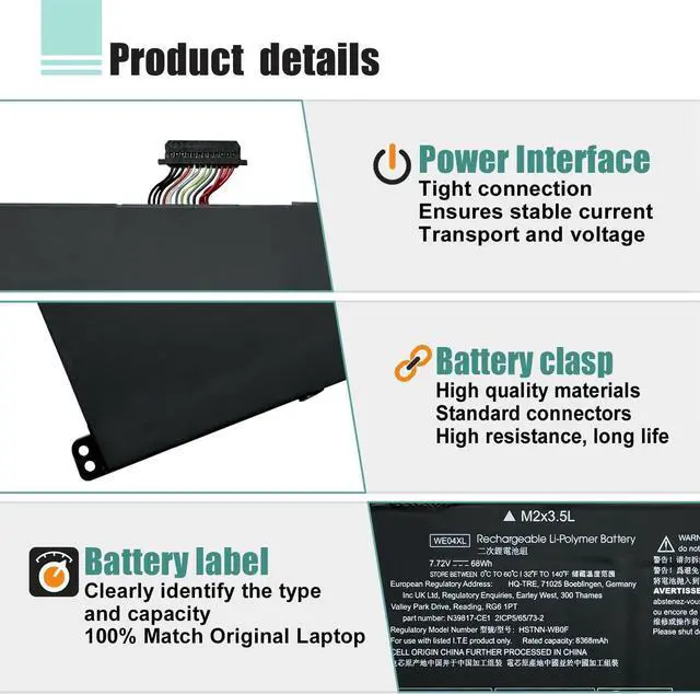 Replacement for Part NumberReplacement for N39857-005, TPN-DB1Q, WE04XL, WE04068XL, HSTNN-WB0F, N39817-2C1, N39817-2D1, N39817-CE1, N39817-CF1.