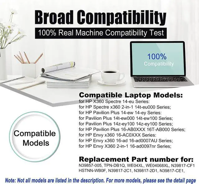 Compatible with ModelsFor HP Pavilion Plus 14-ew Series,For HP Pavilion Plus 14-ey Series,For HP X360 Spectre 14-eu Series, For HP Pavilion Plus 16-AB0XXX Series, For HP Pavilion Plus 90N29PA 90N32PA 90N38PA 90N45PA 90N49PA 90N62PA 93T28PA 95S65PA Series, For HP PAVILION PLUS 16T-AB000 Series, For HP Envy x360 16-AC0XXX Series,For HP Envy x360 16-ad 16-ad0007AU Series, For HP Envy x360 16-ad 16-ad0007AU Series, For HP Envy X360 2-in-1 16-ad0097nr Series, For HP Envy X360 9S1R9UA 9V7D9PA 9V7N1PA 9W639PA 9W677PA 9X2S6PA A01HYPA A01J1PA A19Y6PA A1KX1PA Series.