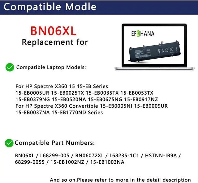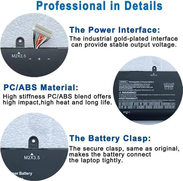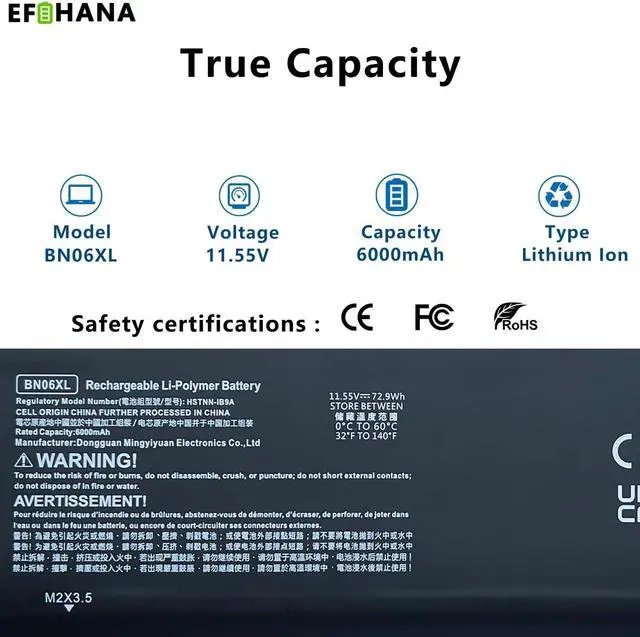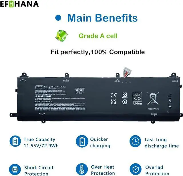 [Specifications] Model: BN06XL // Battery type: Li-ion // Voltage: 11.55V // Capacity: 72.9Wh/6000mAh // 100% New from Manufacturer. Top circuit boards and smart chip