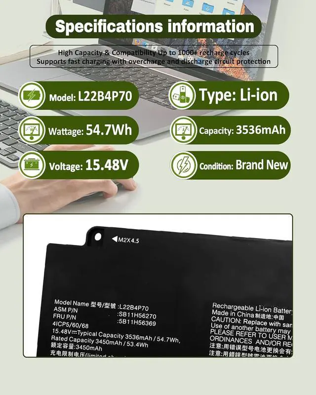 Compatible ModelsReplacement for Lenovo ThinkPad X13 Gen 4 (Type: 21J3, 21J4, 21EX, 21EY) Series; for Lenovo ThinkPad X13 Yoga Gen 4 (Type: 21F2, 21F3) Series; for Lenovo ThinkPad X13 Gen 5 (Type: 21LU, 21LV) Series; for Lenovo ThinkPad X13 2-in-1 Gen 5 (Type: 21LW, 21LX) Series. (Note: There are two types of high capacity 54.7Wh L22B4P70 & low capacity 41WH L22C3P74 .