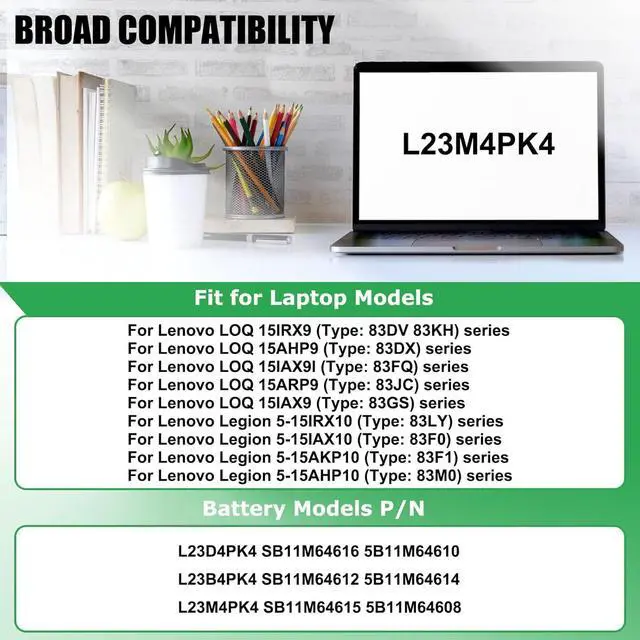 COMPATIBLE LAPTOP MODELS: Battery replacement for Lenovo LOQ 15IAX9I (Type: 83FQ) series; for Lenovo LOQ 15IAX9 (Type: 83GS) series; for Lenovo LOQ 15IRX9 (Type: 83DV 83KH) series; for Lenovo LOQ 15AHP9 (Type: 83DX) series; for Lenovo LOQ 15ARP9 (Type: 83JC) series; for Lenovo Legion 5-15IRX10 (Type: 83LY) series; for Lenovo Legion 5-15IAX10 (Type: 83F0) series; for Lenovo Legion 5-15AKP10 (Type: 83F1) series; for Lenovo Legion 5-15AHP10 (Type: 83M0) series