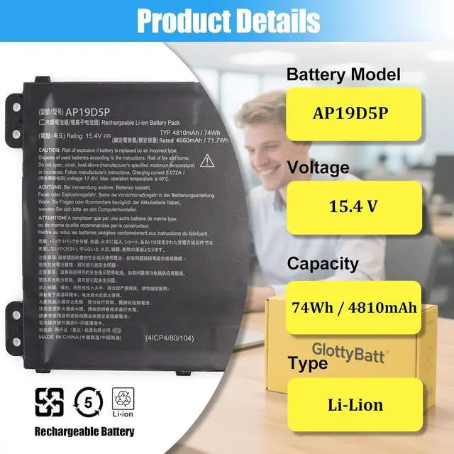 BATTERY SPECIFICATION: Model Name: AP19D5P; Voltage: 15.4V; Capacity: 74Wh 4810mAh; Battery Type: Li-ion; Condition: 100% brand new from manufacturer; Package include: 1*battery + battery installation screwdrivers + 1*instruction for laptop battery