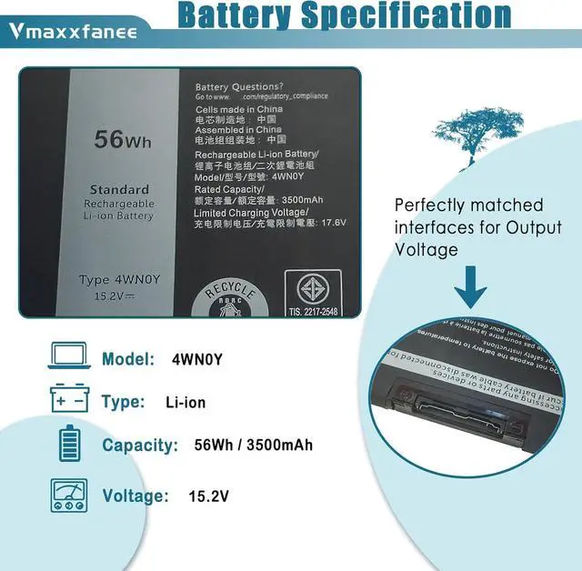 4WN0Y battery Specifications Model: 4WN0Y. Voltage:15.2V . Capacity:56Wh/3500mAh Condition: 100% brand New from Manufacturer.