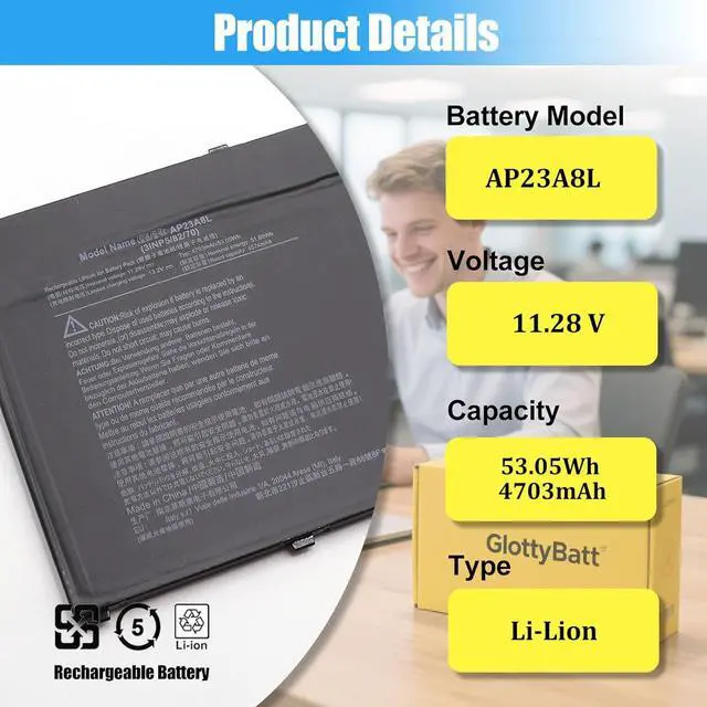 BATTERY SPECIFICATION: Model Name: AP23A8L; Voltage: 11.28V; Capacity: 53.05Wh 4703mAh; Battery Type: Li-ion; Condition: 100% brand new from manufacturer; Package include: 1*battery + battery installation screwdrivers + 1*instruction for laptop battery