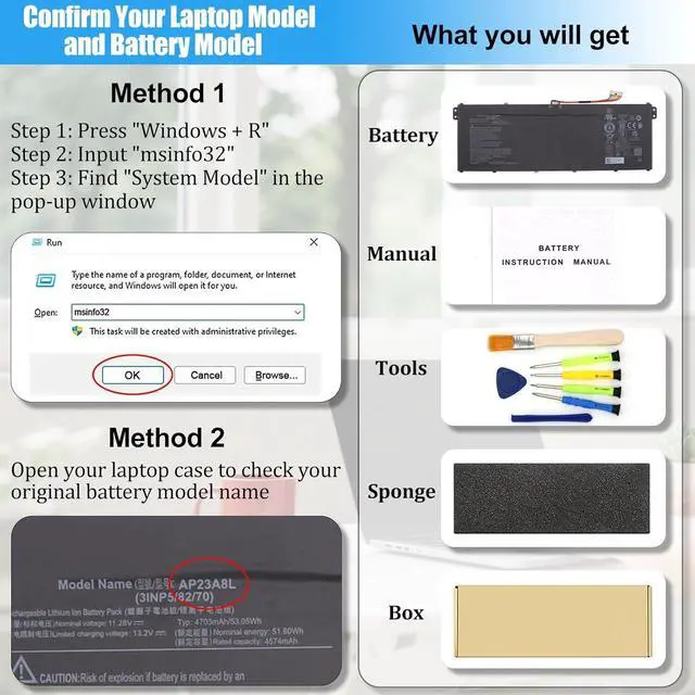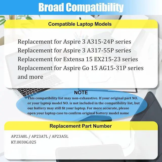 COMPATIBLE LAPTOP MODELS: This Laptop battery AP23A8L replacement for Acer Aspire 3 A315-24P series, Battery Replacement for Aspire 3 A317-55P series, Battery Replacement for Extensa 15 EX215-23 series, Battery Replacement for Aspire Go 15 AG15-31P series