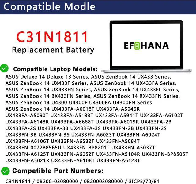 Compatible with Laptop ModelsFit for ASUS ZenBook 14 UX433FA-A6018T, UX433FA-A5046R UX433FA-A5090T, UX433FA-A5133T, UX433FA-A5941T, UX433FA-A6102T, UX433FA-A6148R UX433FA-A6688T, UX433FA-A6019R, UX433FA-2B, UX433FA-2S, UX433FA-3B, UX433FA-3S UX433FN-2B, UX433FN-2S, UX433FN-3B, UX433FN-3S, UX433FN-A6023T, UX433FN-A6024T UX433FN-A6106T, UX433FN-A6532T, UX433FN-A5084T, UX433FN-0072B8565U UX433FN-BP8201T, UX433FN-A5037T, UX433FN-A6125T, UX433FN-A6052T, UX433FN-A5104R UX433FN-BP8505T, UX433FN-A5021R, UX433FN-A6108T, UX433FN-A6123T