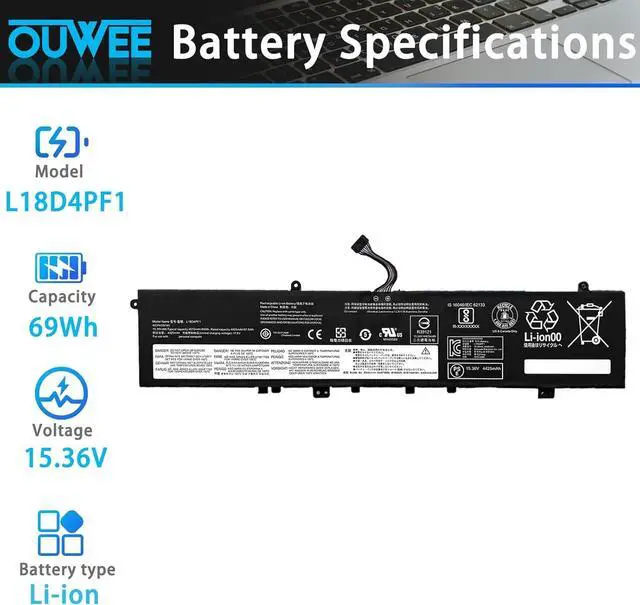 Specifications L18D4PF1 battery for Lenovo IdeaPad Replacement Battery, Type: Li-ion; Our L18D4PF1 Battery Replacement for Lenovo 69wh Standard L18D4PF1 Rechargeable li-ion battery.Voltage: 15.36V; Capacity: 69Wh 4500mAh; Color: Black;Condition: New;