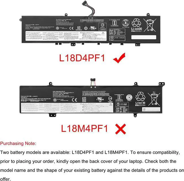 Replacement Battery Part NumbersBattery for L18D4PF1 / L18M4PF1 / 5B10U65277 / 5B10U65276 / 5B10W67244 / SB10W67267 / 5B10T83738 / 5B10W67392 / 5B10W69461Please note that the L18D4PF1 comes in two distinct designs, each tailored for different laptop models. Prior to making a purchase, we strongly recommend opening the back cover of your laptop. This will help you confirm that the model you intend to buy exactly matches the product shown in the pictures.
