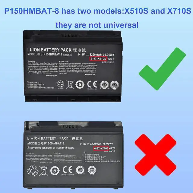 P150HMBAT-8 X510S Laptop Battery Capacity: 76.96Wh; Voltage: 14.8 V; Cell:8; Color: Black.P150HMBAT-8 has two models:X510S and X710s they are not universal,Attentionthis is X510S.