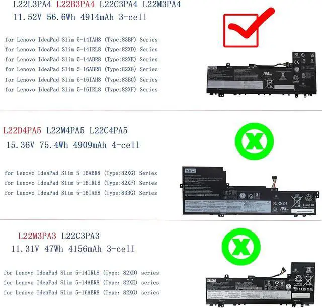 Compatible with Machine Models for Lenovo IdeaPad Slim 5-14ABR8 (Type:82XE) Series; for Lenovo IdeaPad Slim 5-14IRL8 (Type:82XD) Series; for Lenovo IdeaPad Slim 5-14IAH8 (Type:83BF) Series; for Lenovo IdeaPad Slim 5-16ABR8 (Type:82XG) Series; for Lenovo IdeaPad Slim 5-16IRL8 (Type:82XF) Series; for Lenovo IdeaPad Slim 5-16IAH8 (Type:83BG) Series (Note: This battery is only compatible with the IdeaPad Slim and is not compatible with the IdeaPad Flex. Lenovo IdeaPad Slim 5-14 and 5-16 has 3 different capacity batteries (47Wh 56.6Wh 75.4Wh). To save your time and money, please open the laptop back cover before ordering to confirm your battery is the same as described in the picture.)