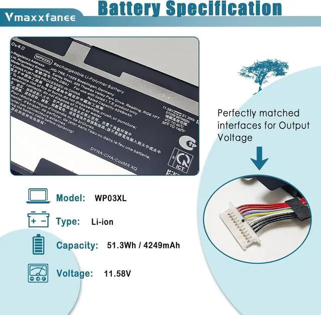 Note WP03XL battery has two different type : WP03XL 51.3Wh and WP03XL38Wh. They are not Compatible with each other. They have different shape. Please make sure your shape is the same as in the picture before purchasing.This listing we are selling is WP03XL-51.3Wh.