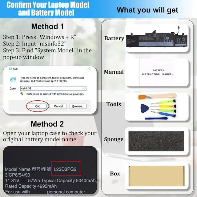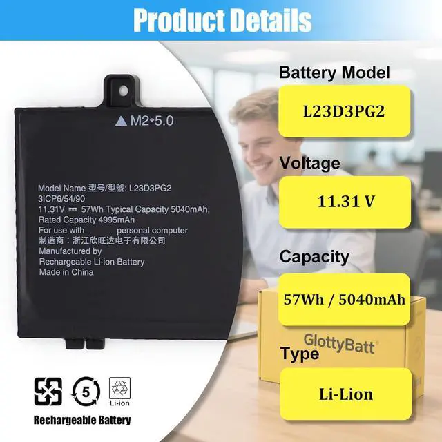BATTERY SPECIFICATION: Model Name: L23D3PG2; Voltage: 11.31V; Capacity: 57Wh 5040mAh; Battery Type: Li-ion; Condition: 100% brand new from manufacturer; Package include: 1*battery + battery installation screwdrivers + 1*instruction for laptop battery
