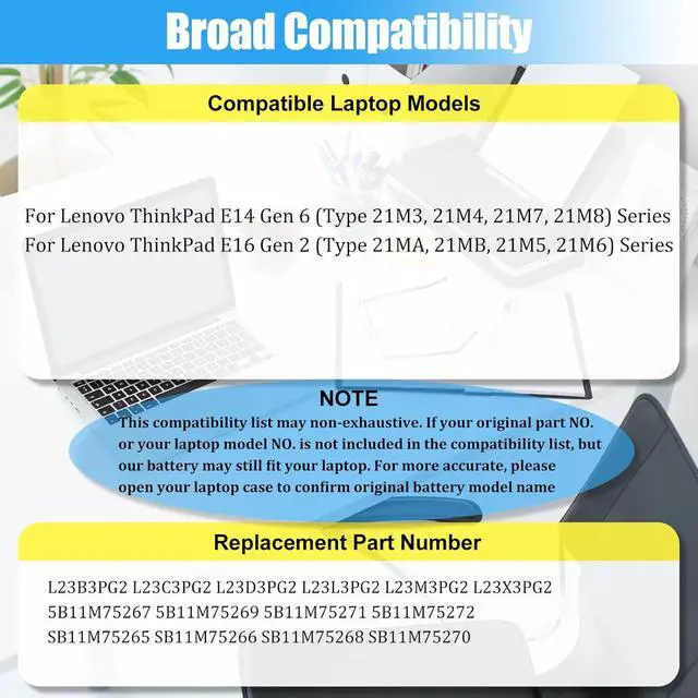 COMPATIBLE LAPTOP MODELS: This Laptop battery L23D3PG2 replacement for Lenovo ThinkPad E14 Gen 6 (Type 21M3, 21M4, 21M7, 21M8) Series; for Lenovo ThinkPad E16 Gen 2 (Type 21MA, 21MB, 21M5, 21M6) Series