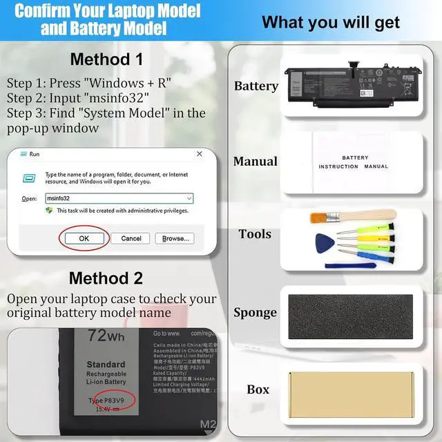 BATTERY SPECIFICATION: Model Name: P83V9; Voltage: 15.4V; Capacity: 72Wh 4442mAh; Battery Type: Li-ion; Condition: 100% brand new from manufacturer; Package include: 1*battery + battery installation screwdrivers + 1*instruction for laptop battery