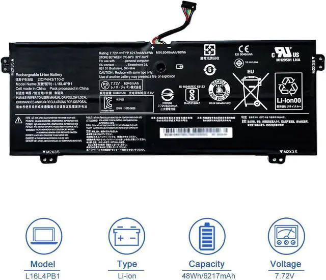 SpecificationsItem Model: L16L4PB1; Product Type: Replacement battery; Battery Type: Li-ion; Voltage: 7.72V; Capacity: 48Wh/6217mAh; Battery Life: Up to 500 recharge cycles over the life of the battery.