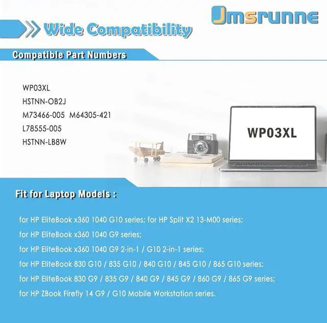 WP03XL battery Compatible laptop Modelsfor HP EliteBook x360 1040 G10 series; for HP Split X2 13-M00 series; for HP EliteBook x360 1040 G9 series; for HP EliteBook x360 1040 G9 2-in-1 / G10 2-in-1 series; for HP EliteBook 830 G10 / 835 G10 / 840 G10 / 845 G10 / 865 G10 series; for HP EliteBook 830 G9 / 835 G9 / 840 G9 / 845 G9 / 860 G9 / 865 G9 series;for HP ZBook Firefly 14 G9 / G10 Mobile Workstation series.