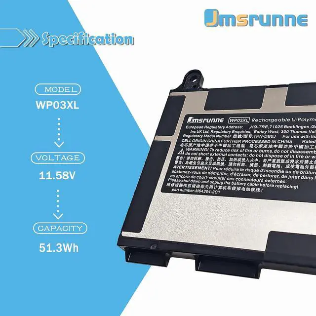 HP WP03XL Specifications Model: WP03XL / Voltage: 11.58V / Capacity: 51.3Wh /Battery type: Li-ion /Battery life: Up to 1000 recharge cycles over the life of the battery. Also comes with installation tools.Purchasing Note: Due to the complexity of laptop battery models, you may not be able to accurately determine the model you need to purchase,Please open the back cover of the laptop to confirm the original battery model number