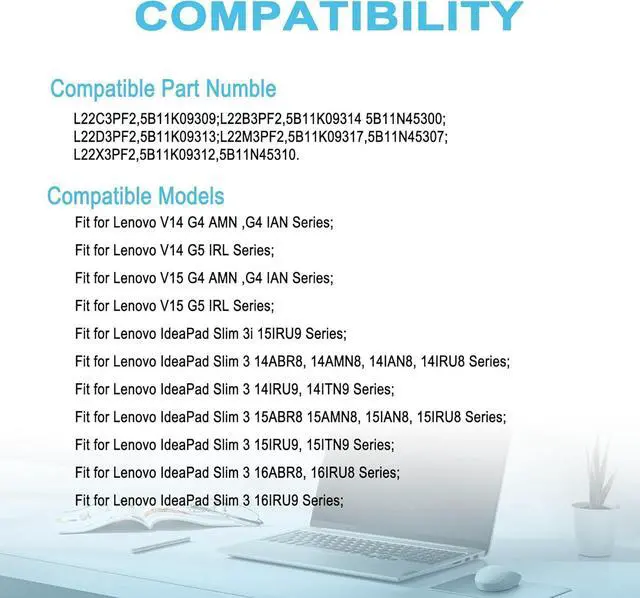 Compatible ModelFit for Lenovo V14 G4 AMN ,G4 IAN Series;Fit for Lenovo V14 G5 IRL Series;Fit for Lenovo V15 G4 AMN ,G4 IAN Series;Fit for Lenovo V15 G5 IRL Series;Fit for Lenovo IdeaPad Slim 3i 15IRU9 Series;Fit for Lenovo IdeaPad Slim 3 14ABR8, 14AMN8, 14IAN8, 14IRU8 Series;Fit for Lenovo IdeaPad Slim 3 14IRU9, 14ITN9 Series;Fit for Lenovo IdeaPad Slim 3 15ABR8 15AMN8, 15IAN8, 15IRU8 Series;Fit for Lenovo IdeaPad Slim 3 15IRU9, 15ITN9 Series;Fit for Lenovo IdeaPad Slim 3 16ABR8, 16IRU8 Series;Fit for Lenovo IdeaPad Slim 3 16IRU9 Series.