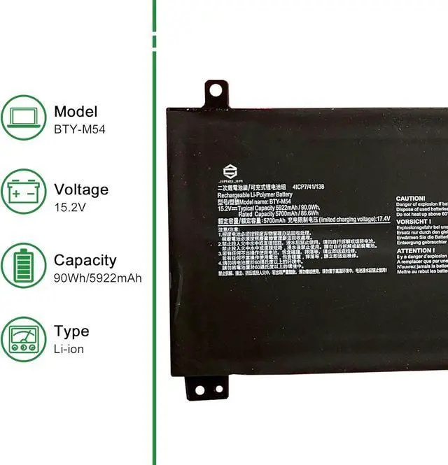 Model: BTY-M54 // Voltage: 15.2V // Capacity: 90Wh 5922mAh // Color: Black // Type: Plug & Play Li-ion Battery.