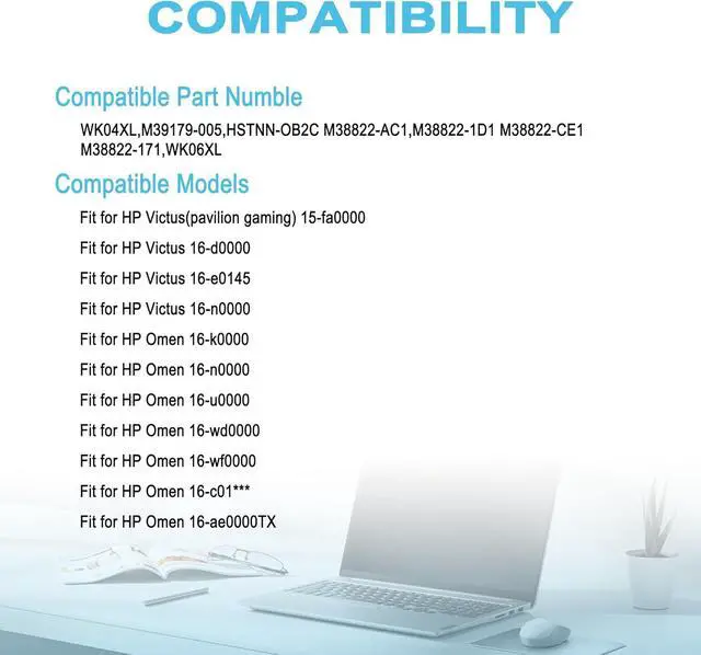 Compatible ModelFit for HP Victus(pavilion gaming) 15-fa0000;Fit for HP Victus 16-d0000;Fit for HP Victus 16-e0145;Fit for HP Victus 16-n0000;Fit for HP Omen 16-k0000;Fit for HP Omen 16-n0000;Fit for HP Omen 16-u0000;Fit for HP Omen 16-wd0000;Fit for HP Omen 16-wf0000;Fit for HP Omen 16-c01*** ;Fit for HP Omen 16-ae0000TX.