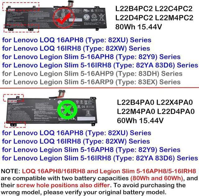 Compatible with Machine Modelsfor Lenovo Legion Slim 5-16AHP9 (Type: 83DH) Series; for Lenovo Legion Slim 5-16APH8 (Type: 82Y9) Series; for Lenovo Legion Slim 5-16ARP9 (Type: 83EX) Series; for Lenovo Legion Slim 5-16IRH8 (Type: 82YA, 83D6) Series; for Lenovo LOQ 16APH8 (Type: 82XU) Series; for Lenovo LOQ 16IRH8 (Type: 82XW) Series