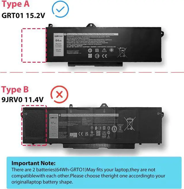 Compatible Part No# GRT01 0R05P0 R05P0 0VXD57 00P3TJ 0P3TJ 05RGW CN-0R05P0 (The length of GRT01 battery is shorter than 9JRV0 battery,and their interfaces are different, they are not compatible with each other)