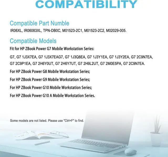 Compatible ModelFit for HP ZBook Power G7 Mobile Workstation Series: G7, G7 1J3X7EA, G7 1J3X7EAG7, G7 1J3Q8EAlG7, G7 1J3Y1EA, G7 1J3Y2EA, G7 2C9N7EA, G7 2C9P1EA, G7 2H6Y0UT, G7 2H6Y7UT, G7 2H9L2UT, G7 2M0E5PA, G7 2C9N7EA. For HP ZBook Power G8 Mobile Workstation Series; For HP ZBook Power G9 Mobile Workstation Series; For HP ZBook Power G10 Mobile Workstation Series; For HP ZBook Power G10 A Mobile Workstation Series.
