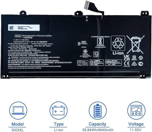 SpecificationsModel Name: SI03XL; Product Type: Replacement battery; Battery Type: Li-ion; Voltage: 11.55V; Capacity: 58.84Wh/4840WmAh; Battery Life: Up to 500 recharge cycles over the life of the battery