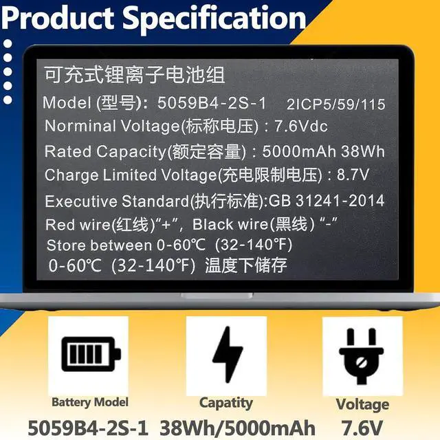 SpecificationsModel: 5059B4-2S-1 Capatity: 38Wh/5000 Voltage:7.6V Battery type: Rechargeable Battery Color: Black 100% brand New from Manufacturer.