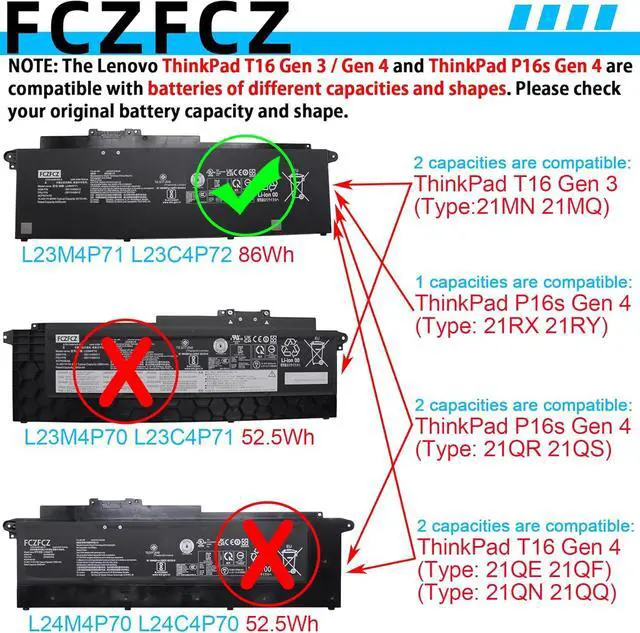 Compatible with Machine Modelsfor Lenovo ThinkPad T16 Gen 3 (Type: 21MN 21MQ )Series; for Lenovo T16 Gen 4 (Type: 22AW 22AX) series; for Lenovo ThinkPad P16s Gen 4 (Type: 21RX 21RY 21QR 21QS) series; for Lenovo ThinkPad T16 Gen 4 (Type: 21QE 21QF 21QN 21QQ) series (Note: There have two types of battery for Lenovo ThinkPad T16 Gen 3, P16s Gen 4, and T16 Gen 4 laptop (52.5Wh and 86Wh with distinct part numbers). Please open the back cover of your laptop to ensure that your original battery is the same as the picture before purchase.)