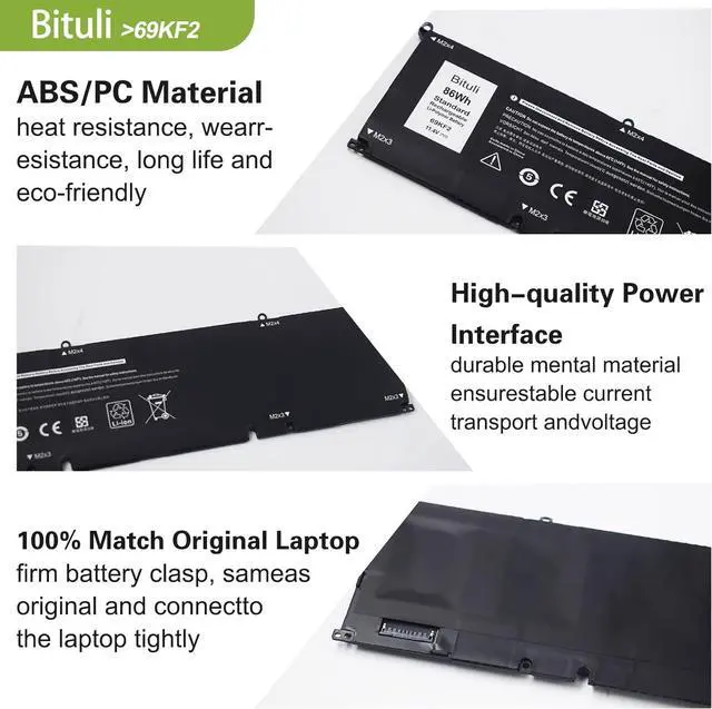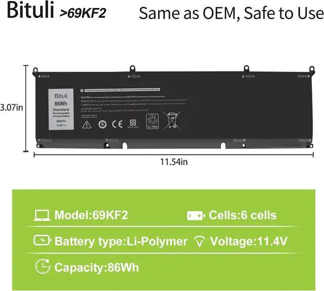 Replacement Battery Specifications: 69KF2 Battery Type: lithium ion Voltage: 11.4V Capacity: 86WH; Cells: 6-cell; Color: Black. This battery provides the same battery life as the original. We are a professional laptop battery manufacturer, providing high quality batteries to ensure the best possible buying experience for our customers